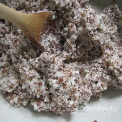 Отделите желтки от белков. Желтки взбейте до белесой пены, добавьте в гречку с творогом.