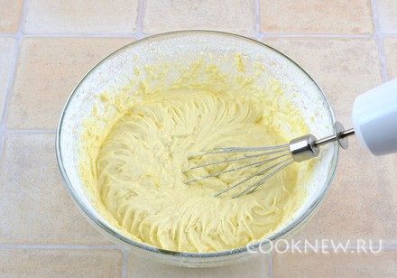 Добавить разрыхлитель и бóльшую часть муки, немного взбить