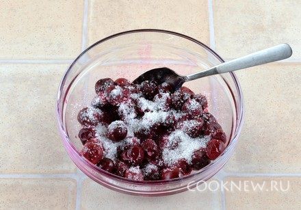 С вишни слить всю жидкость, и хорошо отжать саму вишню. Добавить сахар, перемешать
