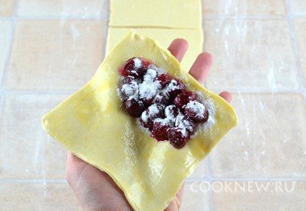 На одну половину квадрата выложить вишню, немного посыпать крахмалом
