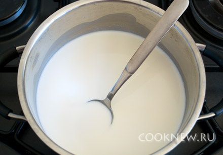 Выключить огонь, добавить разбухший желатин, перемешать до полного растворения желатина. Затем добавить сливки с размолотым миндалем, перемешать.