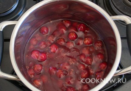 Крахмал залить 50 мл воды, перемешать. При помешивании, тонкой струйкой, влить крахмал в кипящий вишневый отвар. Прогреть 10-15 секунд, выключить огонь. Готовый соус полностью остудить.
