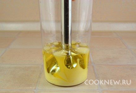 Включить блендер на минимальной скорости. Через несколько секунд на дне стакана появится густая белая эмульсия (это значит что желток начал эмульгировать масло)