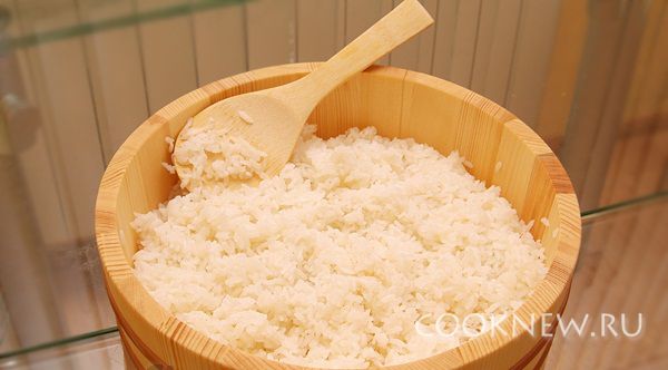 Стакан специального риса, подходящего для суши, тщательно промойте несколько раз, переложите в кастрюлю, добавьте небольшой кусочек водоросли комбу и налейте воды из расчёта 1:1-1,2. Поставьте кастрюлю на средний огонь, доведите рис до кипения, уберите комбу, уменьшите огонь и варите рис около 20 минут, не снимая крышки. После дайте рису постоять минут пятнадцать, переложите его в миску и заправьте рисовым уксусом, смешанным с солью и сахаром (или готовой приправой на основе рисового уксуса)