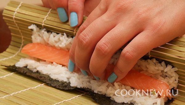 Чтобы свернуть ролл, нужно приподнять край циновки и, придерживая начинку пальцами, совместить верхний край нори с нижним там, где начинается пустой "хвостик" нори
