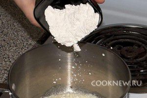 Сливочное масло растопить на сковороде или в небольшом сотейнике и всыпать маленькими порциями муку, перемешивая ее тщательно с маслом.