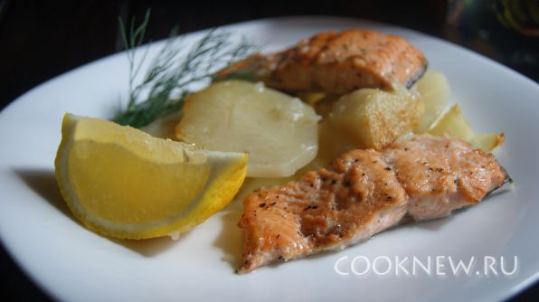 Порционные кусочки горбуши замариновать в лимонном соке и специях(если они есть). Пусть полежат минут 20. А тем временем почистить и отварить картофель до полуготовности
