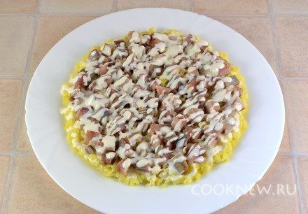 Начинаем выкладывать ингредиенты на блюдо. Выложить картофель, равномерно полить майонезом