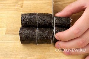 Разрезать ролл пополам, а затем на 3 или 4 части. Подавать с соевым соусом, маринованным имбирем и васаби