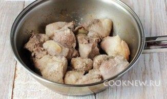 Обжариваем кусочки мяса на подсолнечном рафинированном огне, слегка посолив и поперчив в процессе. Обжаривать нужно не до корочки и не до готовности, мясо должно посветлеть