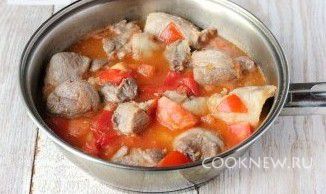 К этому времени свинина обжарилась. Всыпаем в сковороду помидоры.