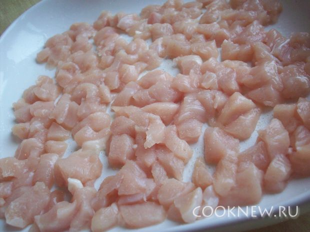 Куриное филе мелко нарезаем и выкладываем в форму.