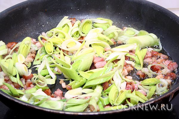 Добавить к бекону лук порей.