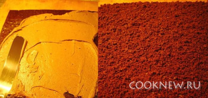 Первый корж нужно обрезать и эти обрезки измельчаем, чтобы получились крошки. Промазываем коржи кремом и оставляем пропитываться. (лучше на ночь).