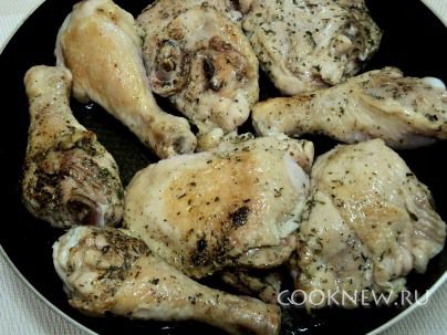 Лук отложить на дуршлаг, а курочку разделить на порционные куски, посолить, поперчить, обжарить.
