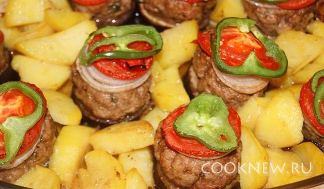 Картофель почистить, нарезать крупными дольками и отварить в кипящей воде 5 минут. Воду слить, достать бифштексы. добавить оставшееся масло и разложить между нашим блюдом картофельные дольки. Поставить в духовку еще на 30-40 минут.