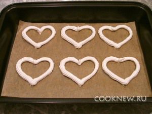 Белковую массу переложить в шприц или полиэтиленовый пакет с отрезанным уголком. Обрисовать сердечки.